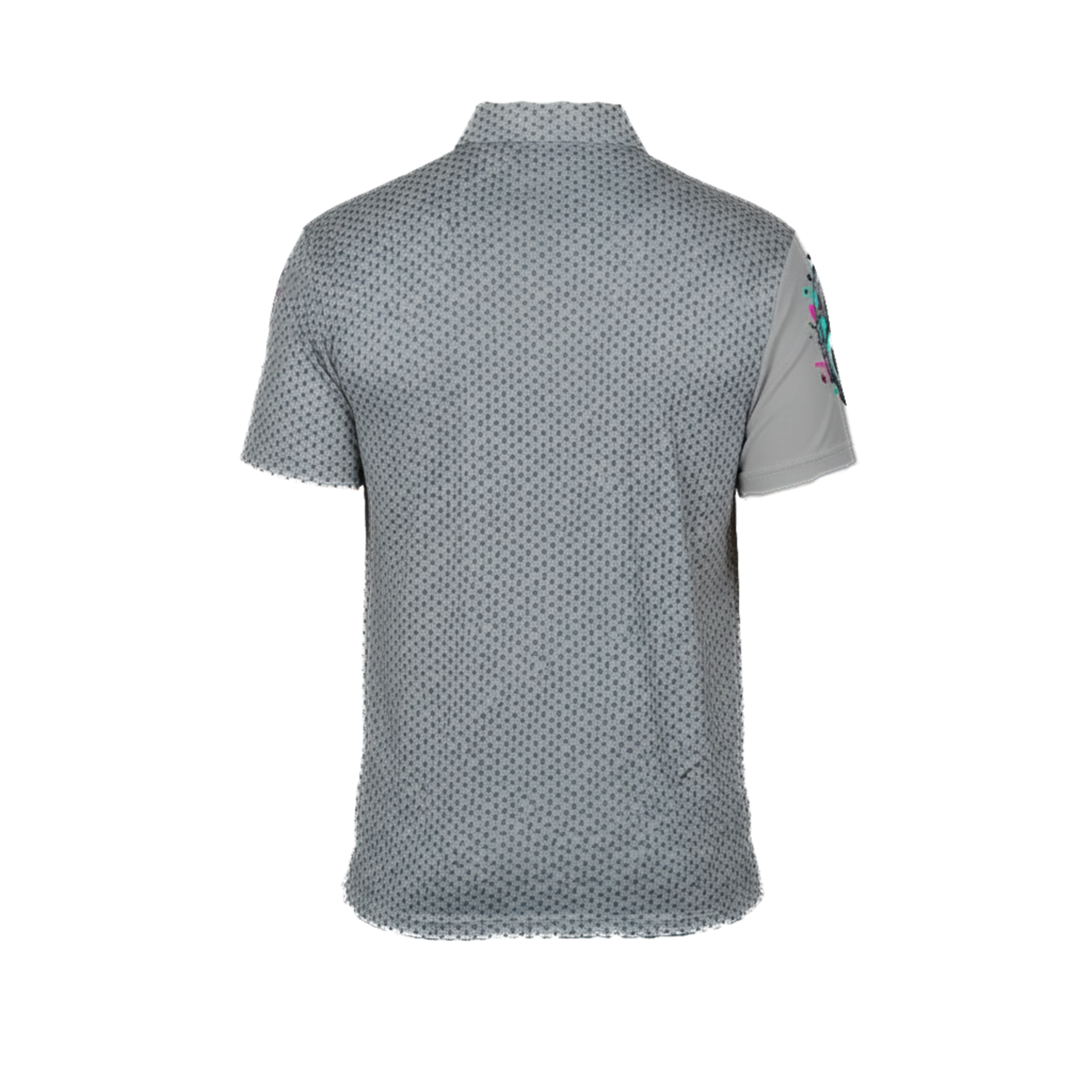A lightweight, all-over-print polo that blends sporty comfort with subtle street-edge. The breathable polyester body keeps you dry while the pointed collar and three-button placket give a clean, familiar silhouette. Muted gray canvas is accented by textured sleeve and collar patterns and a vertical, slightly glitchy “NOTGPT” graphic that reads like a playful, tech-savvy tag. Wear it when you want something low-effort but visually distinct — an easy top for warm days, layering under a light jacket, or lending a casual nod to creative, digital-minded style.